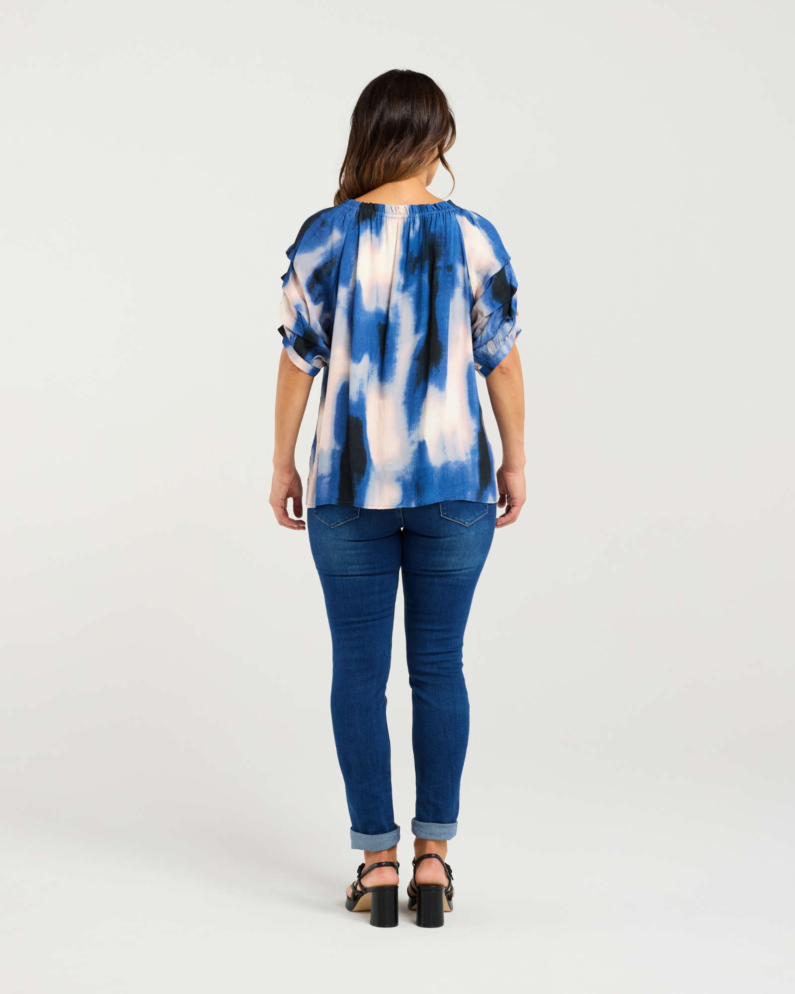 This top features a round neckline and gathered short sleeves for added volume, crafted from a beautifully printed fabric for a refined and polished look.