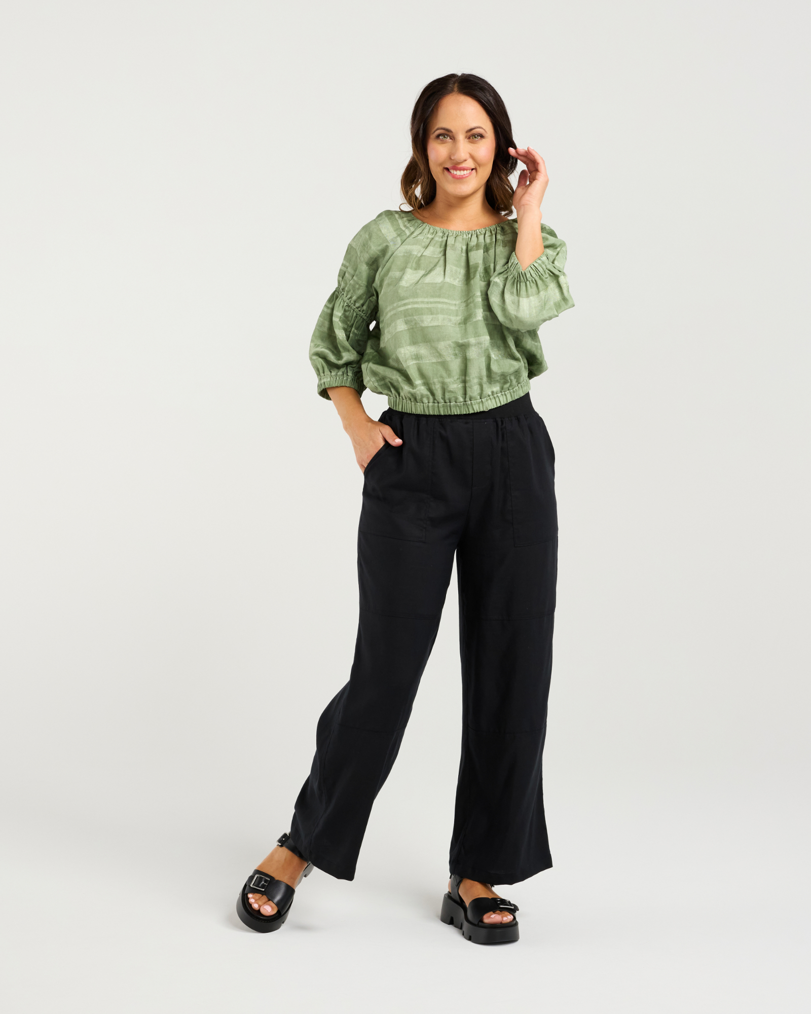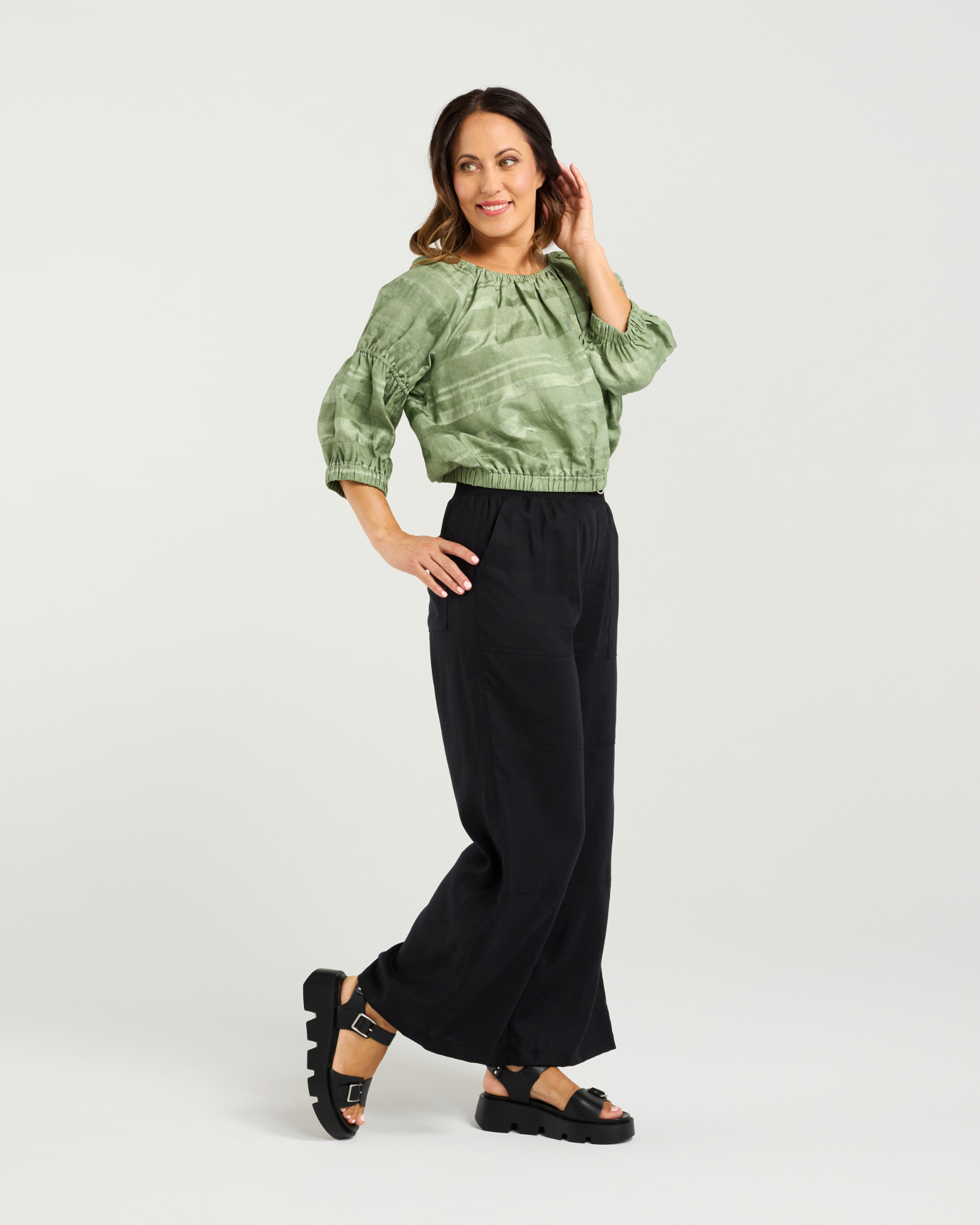 This top features elasticated three-quarter sleeves and hemline, with a fully ruched design all around, offering a stylish and flattering fit.