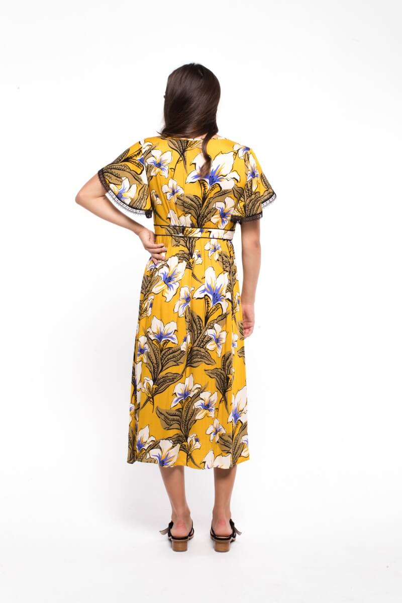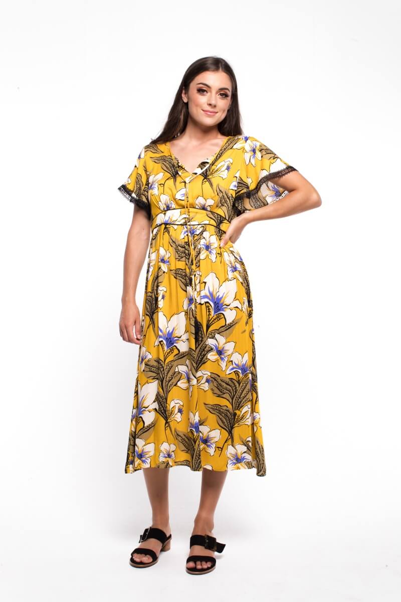 This compliment-worthy dress can be worn casual or dressy just by changing your shoes. With waist-defining detail and lace trim flutter sleeves.