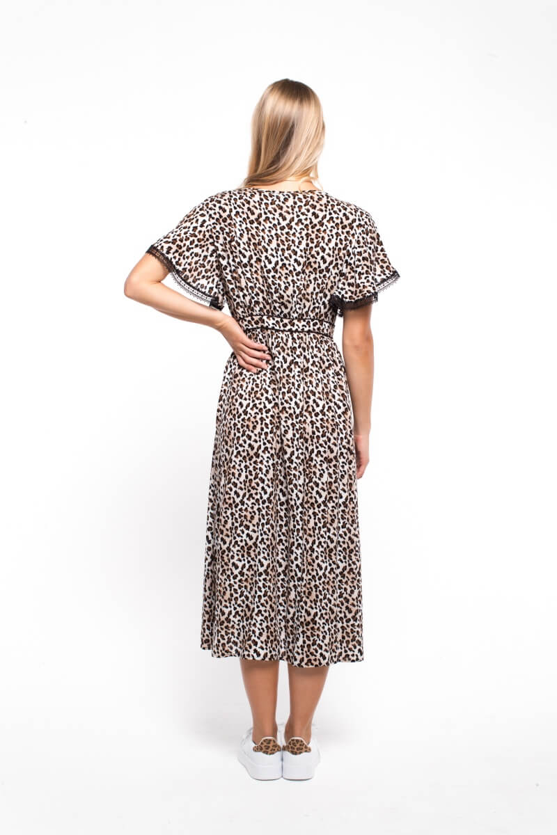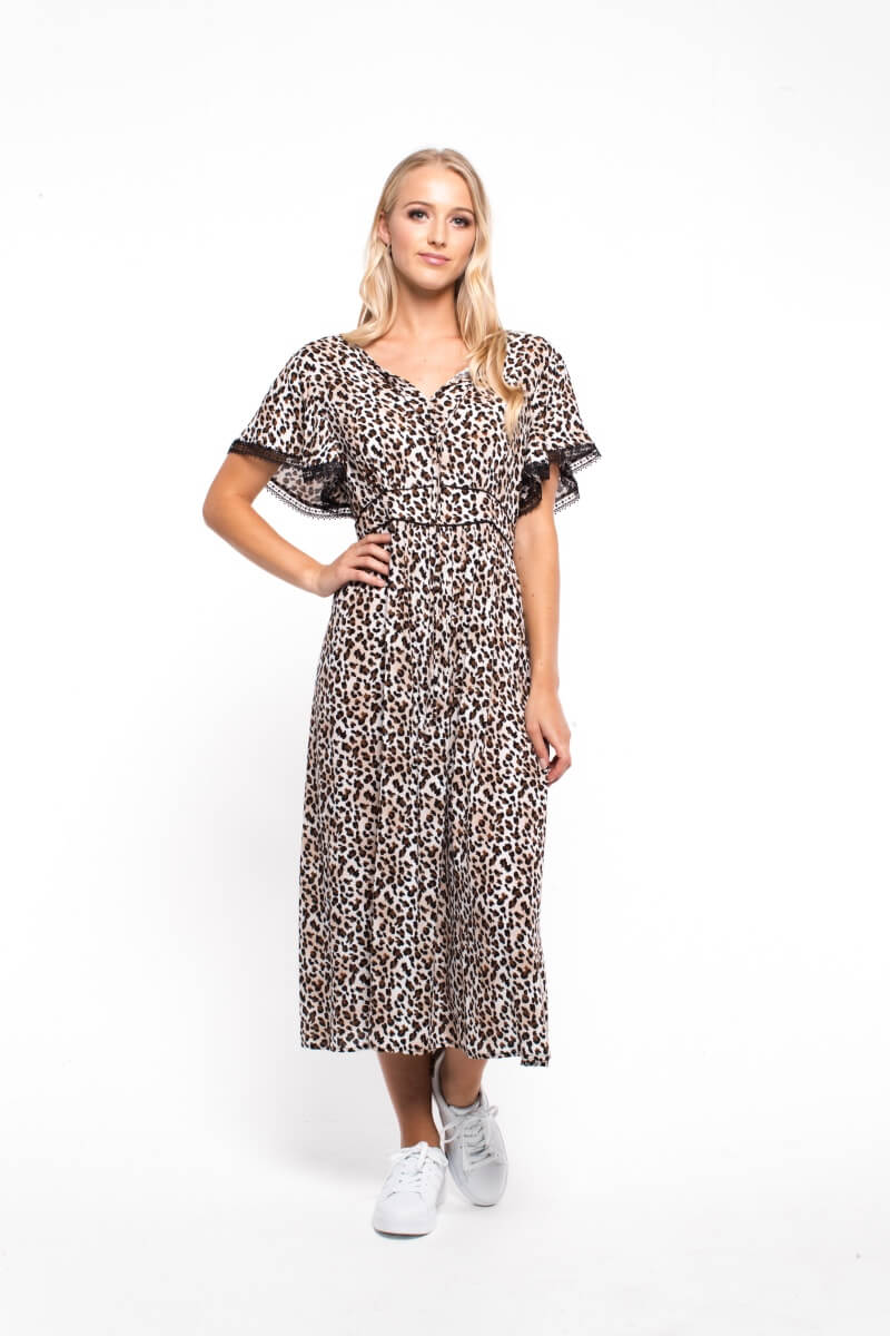 This compliment-worthy dress can be worn casual or dressy just by changing your shoes. With waist-defining detail and lace trim flutter sleeves.