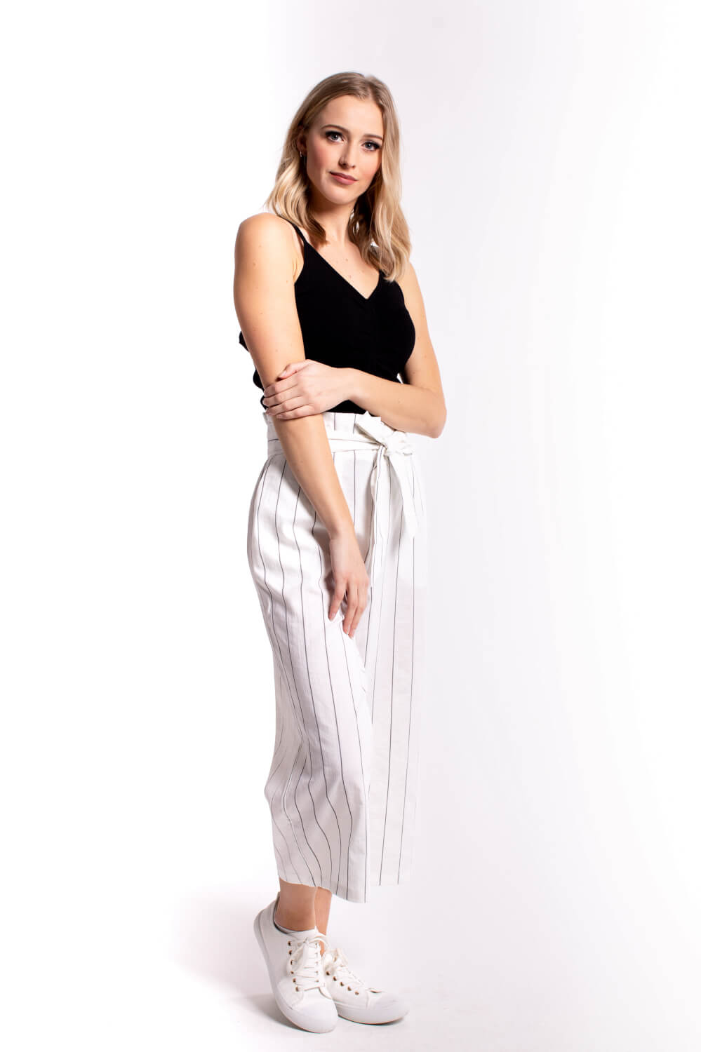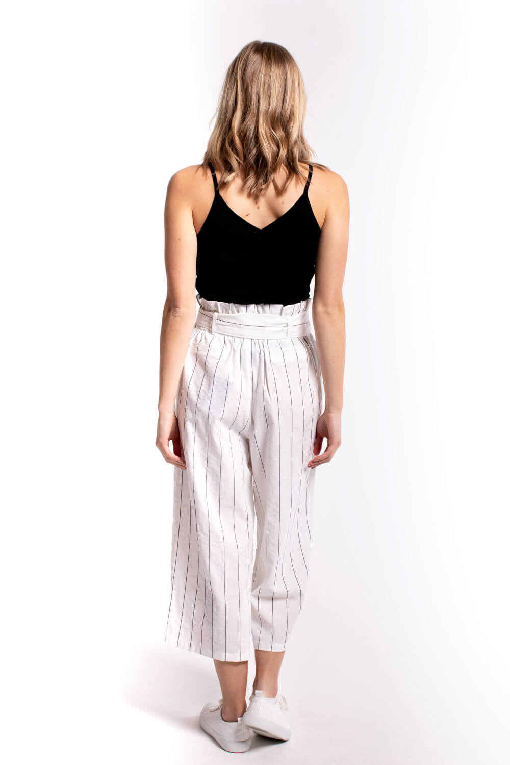 A cropped wide leg pant with ultra flattering paper bag style tie waist. Dress up or down.