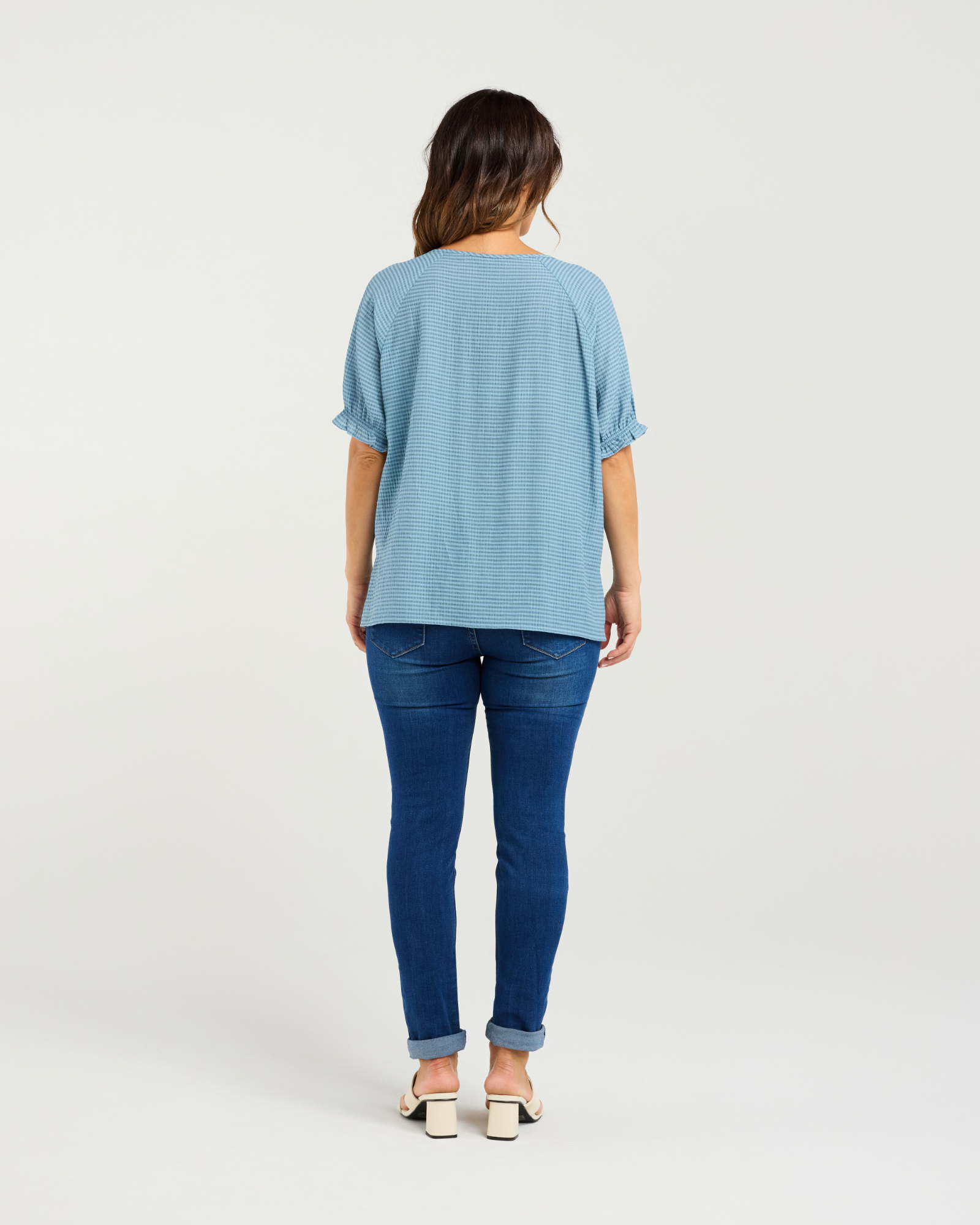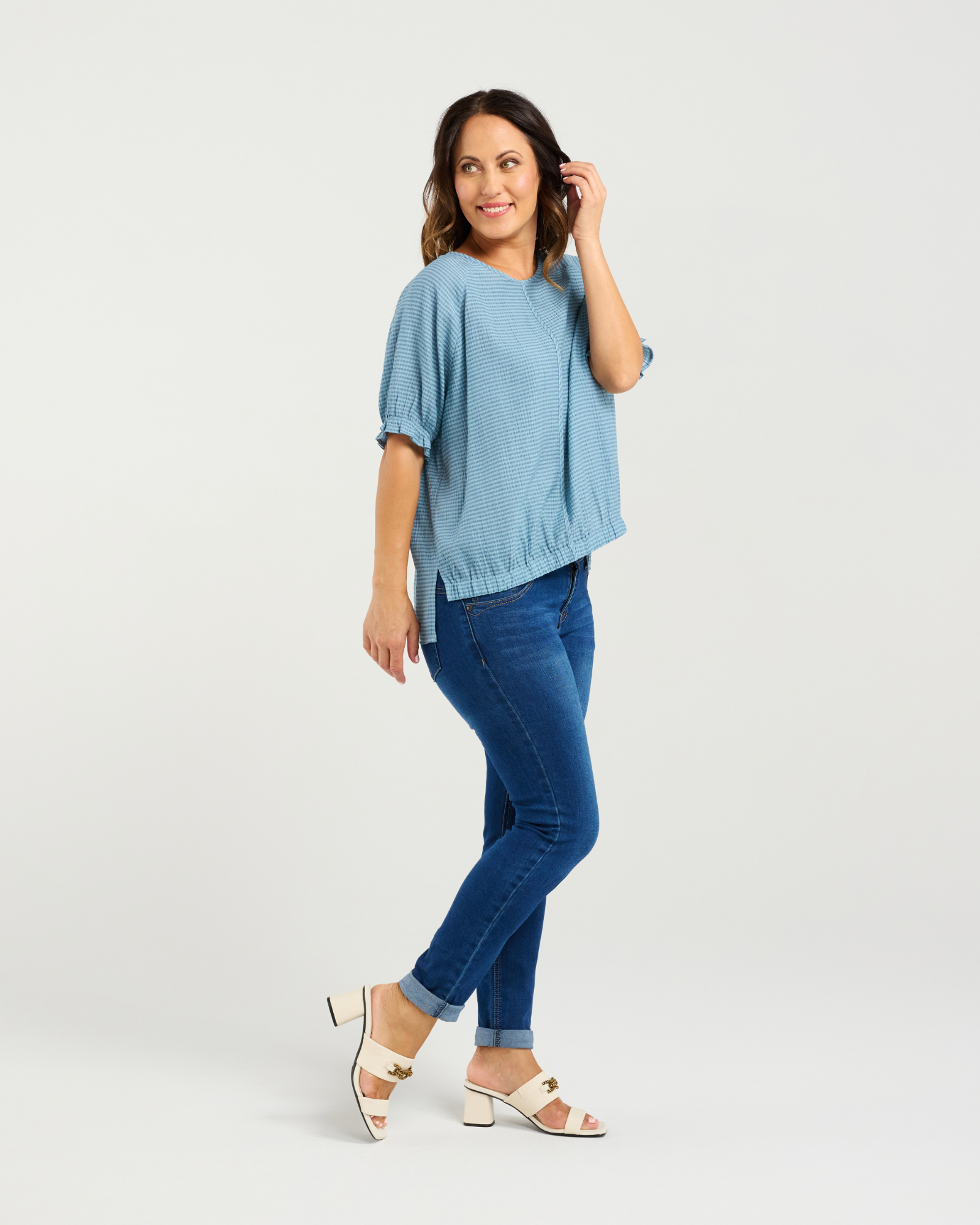 This versatile top combines comfort and style with elbow-length elasticated sleeves and a front hemline that�s gently gathered for a flattering fit. The longer back hem and side split add movement, while the round neckline keeps it casual and easy to wear.