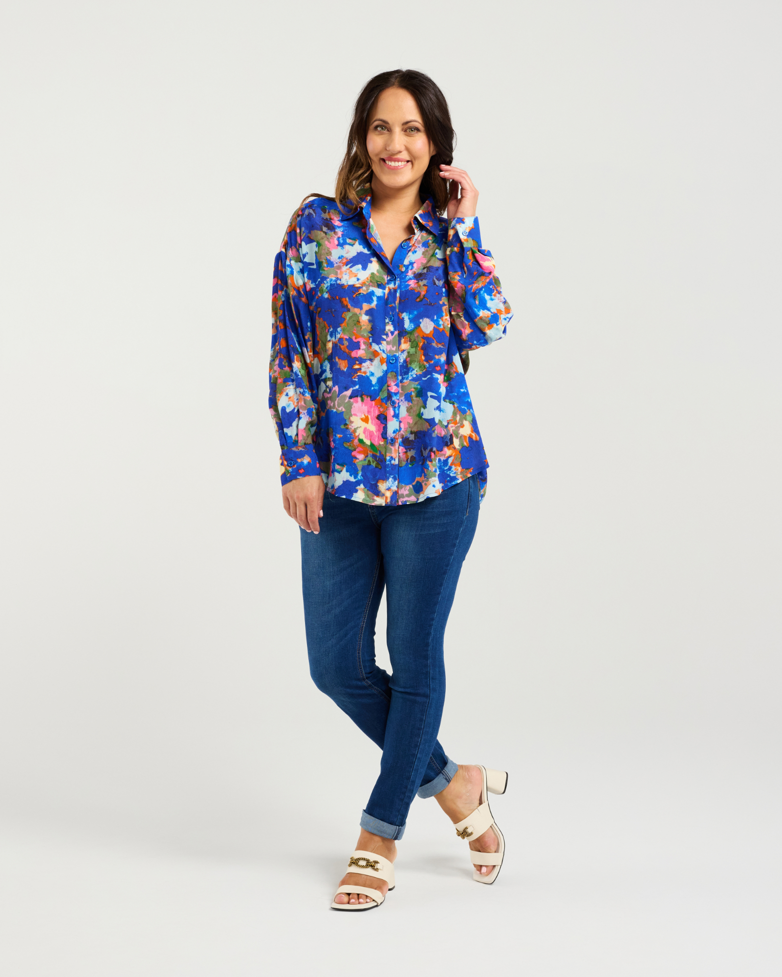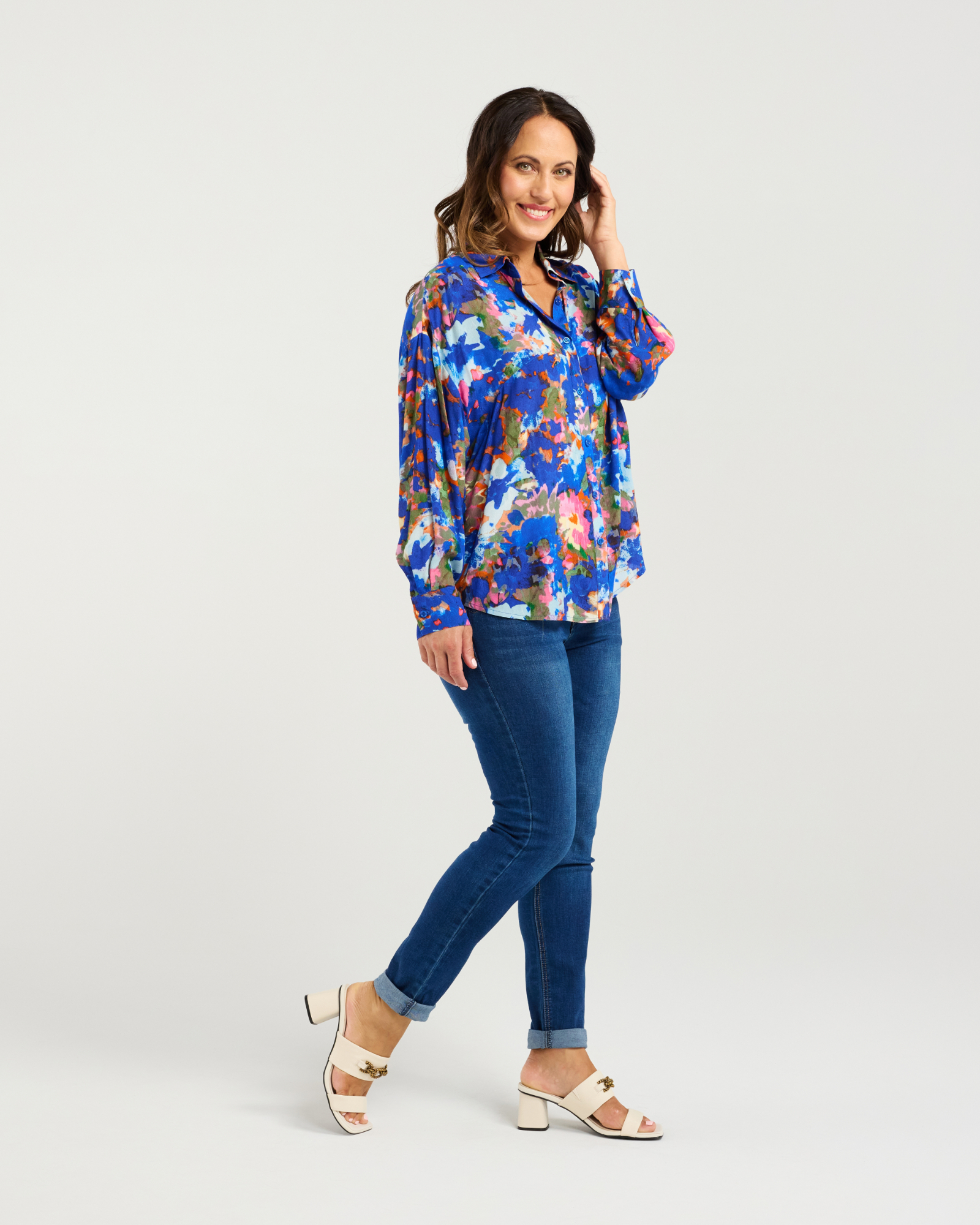 This modern long-sleeve shirt is distinguished by its keyhole opening at the back neckline and elegant draping details, creating a subtle sophisticated and contemporary silhouette.