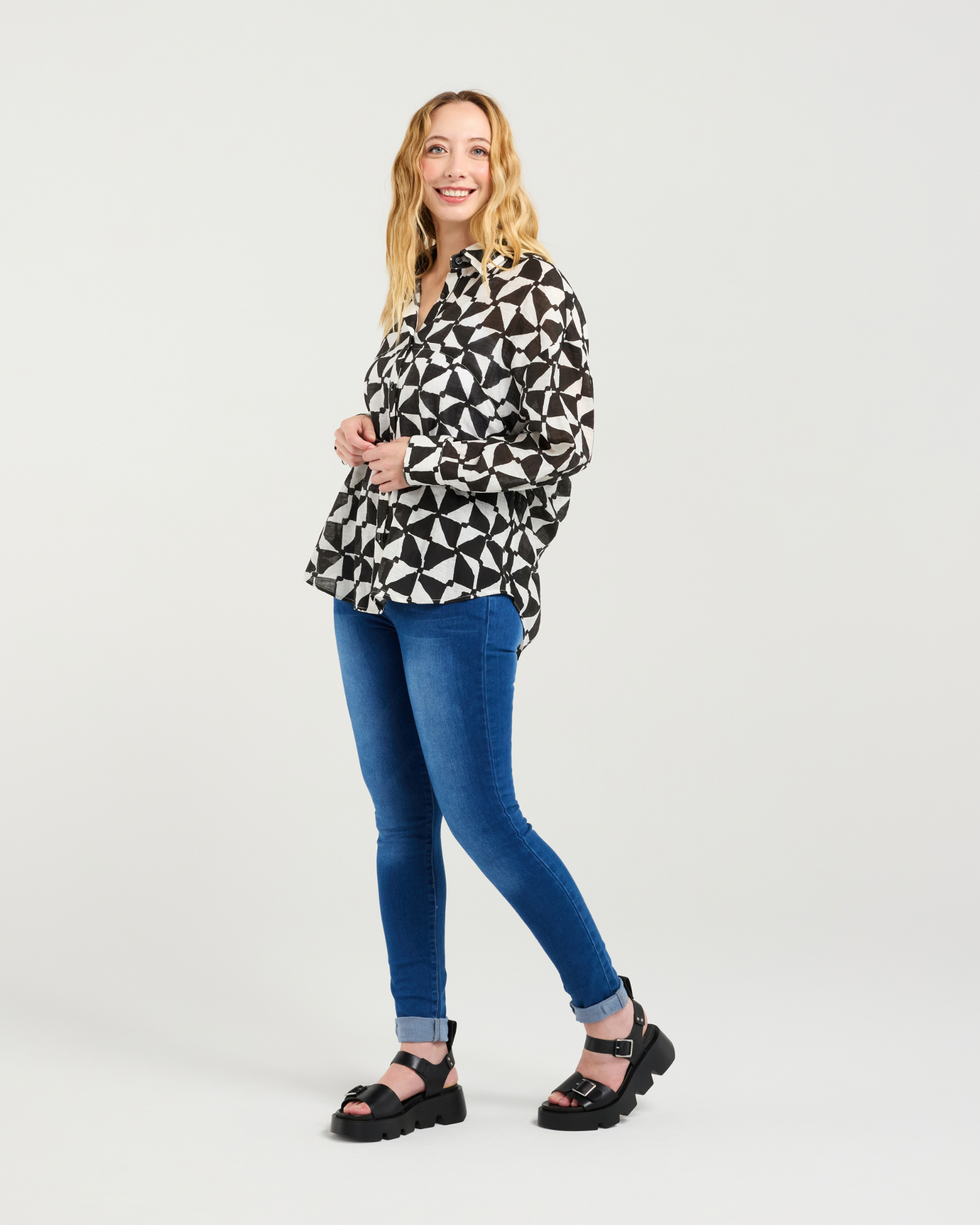 This modern long-sleeve shirt is distinguished by its keyhole opening at the back neckline and elegant draping details, creating a subtle sophisticated and contemporary silhouette.