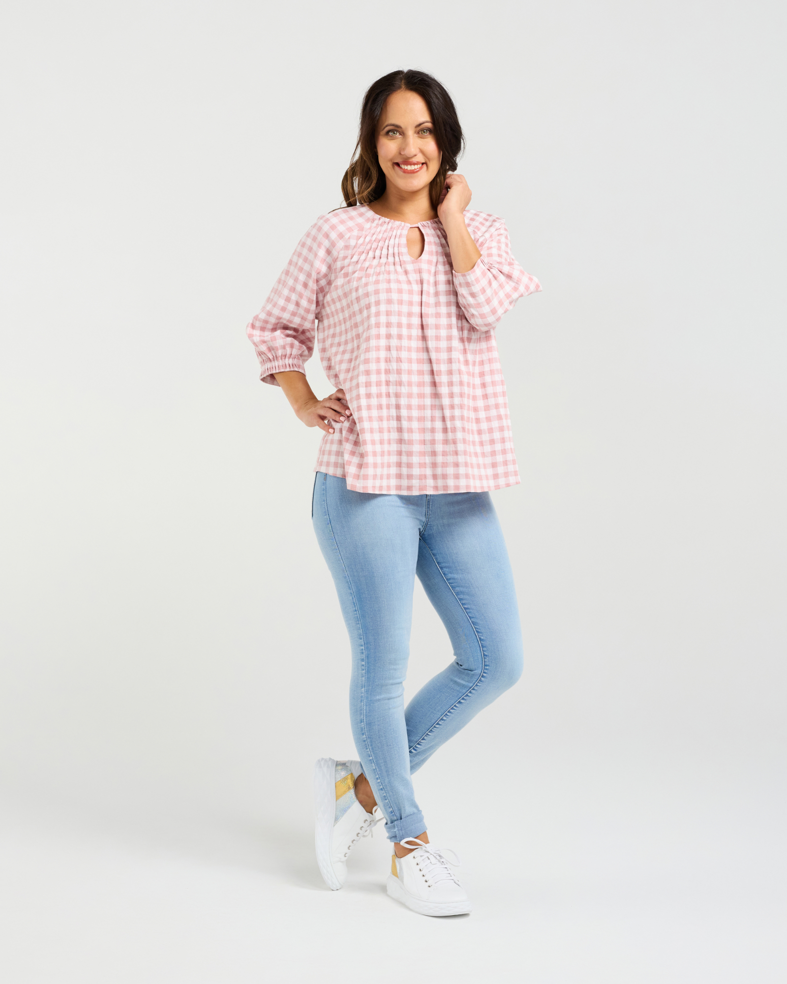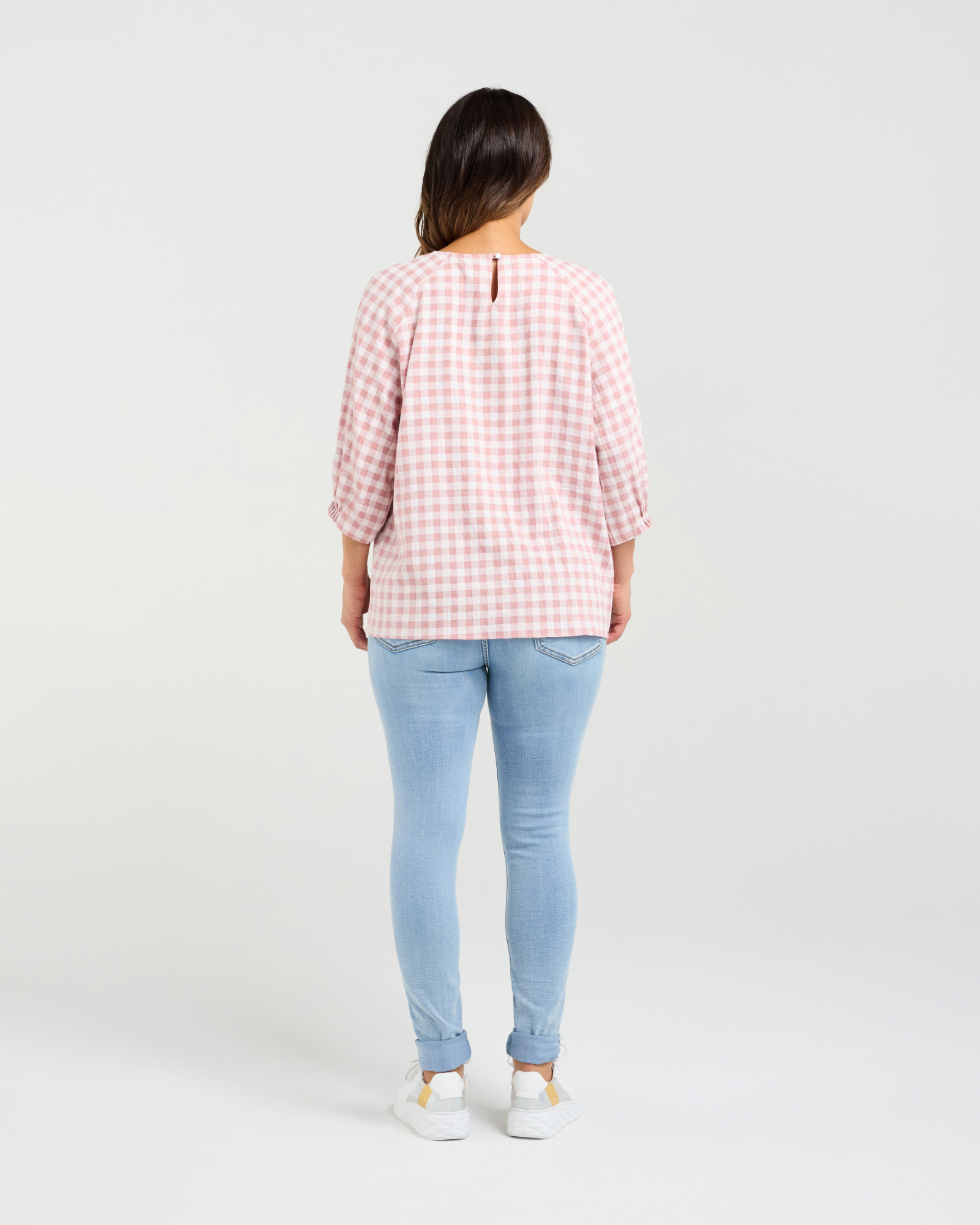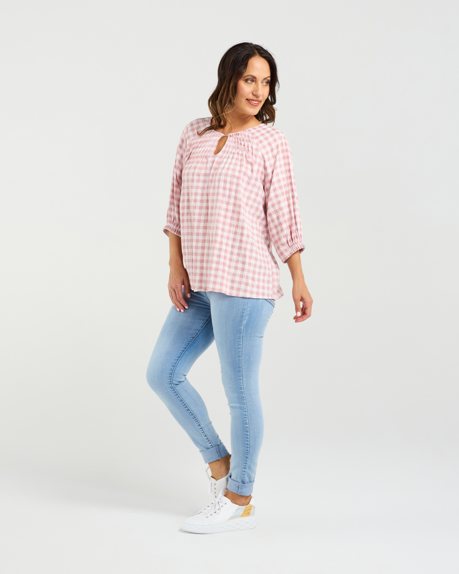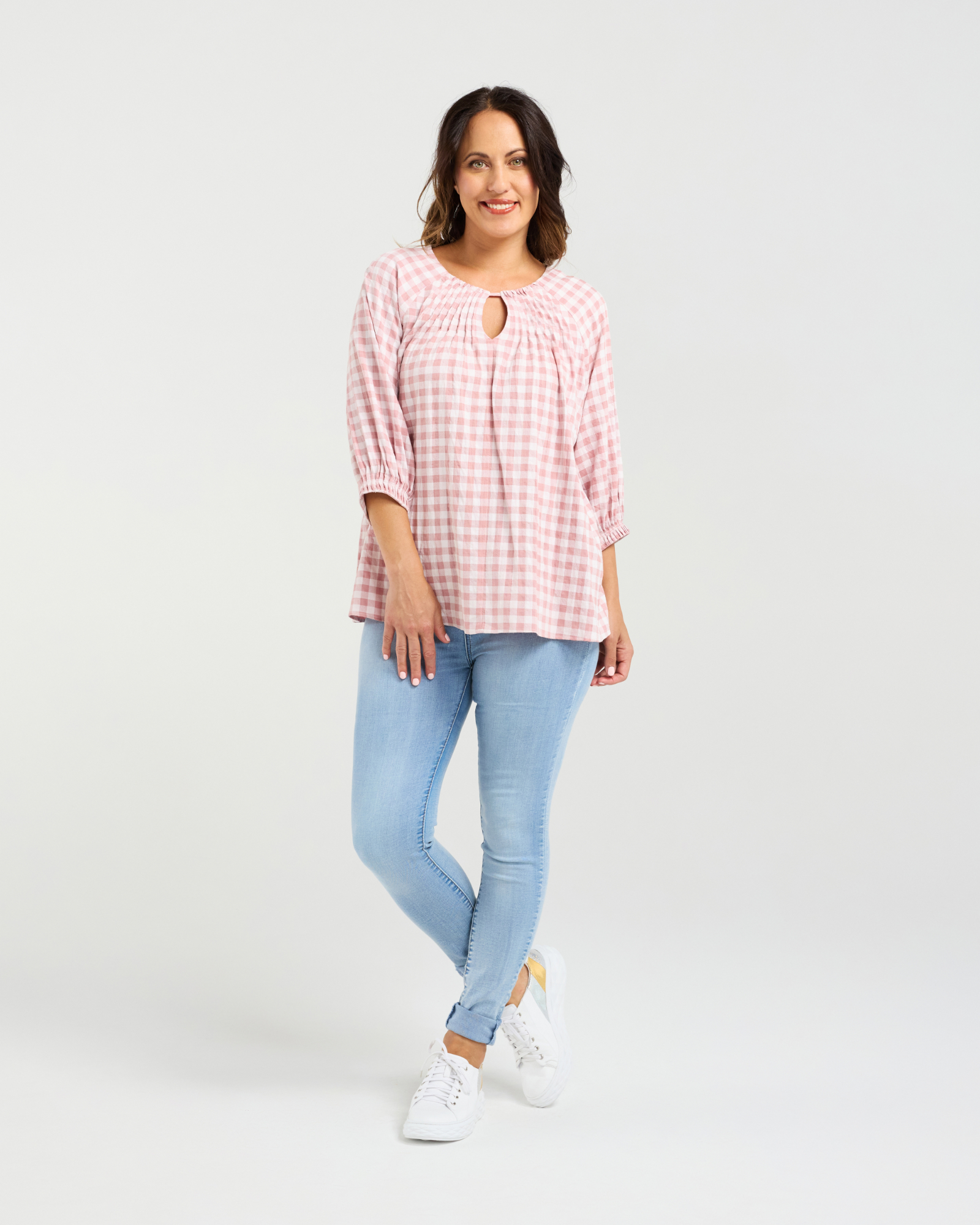 This relaxed-fit top features a round neckline with a keyhole and gathered detailing for a touch of elegance. The 3/4 sleeves are elasticated for comfort, and the beautiful check fabric comes in multiple colors, offering a stylish and versatile addition to your wardrobe.