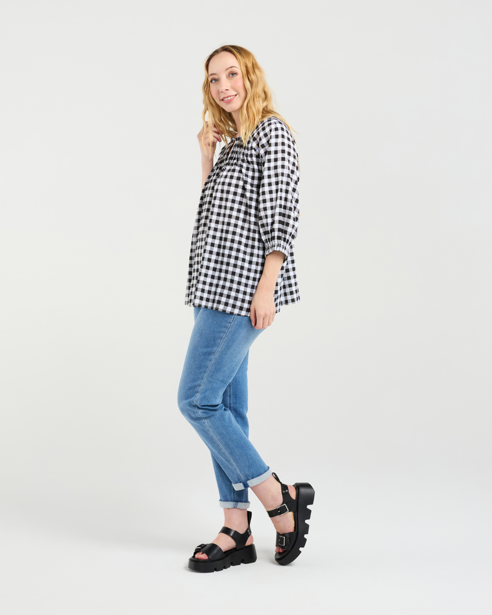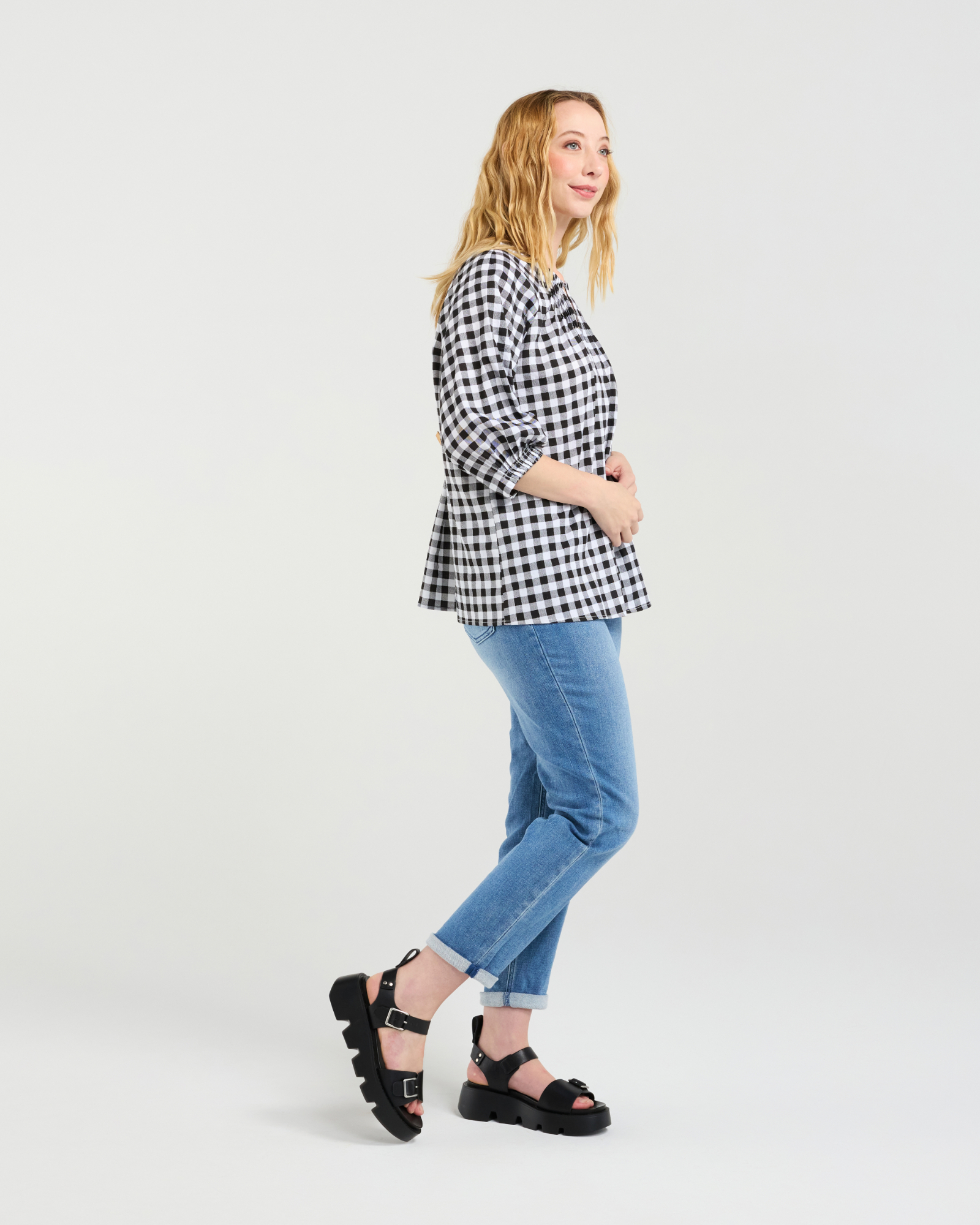 This relaxed-fit top features a round neckline with a keyhole and gathered detailing for a touch of elegance. The 3/4 sleeves are elasticated for comfort, and the beautiful check fabric comes in multiple colors, offering a stylish and versatile addition to your wardrobe.