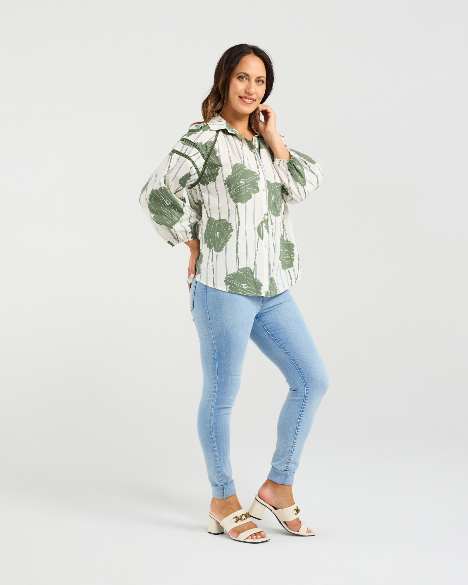 This standout shirt features a classic collar and elasticated 3/4 sleeves, elevated with trim inserts at the shoulder for a touch of detail. Cut from a bold green floral print fabric, it�s a fresh statement piece with everyday ease.