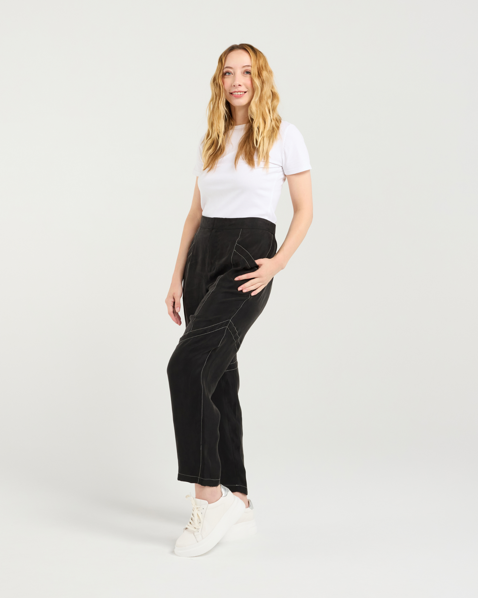 These pants feature an elasticated back for a comfortable, easy fit. The unique panel design adds an interesting touch, while the super-soft fabric ensures a relaxed and luxurious feel, making them perfect for both casual and elevated looks.