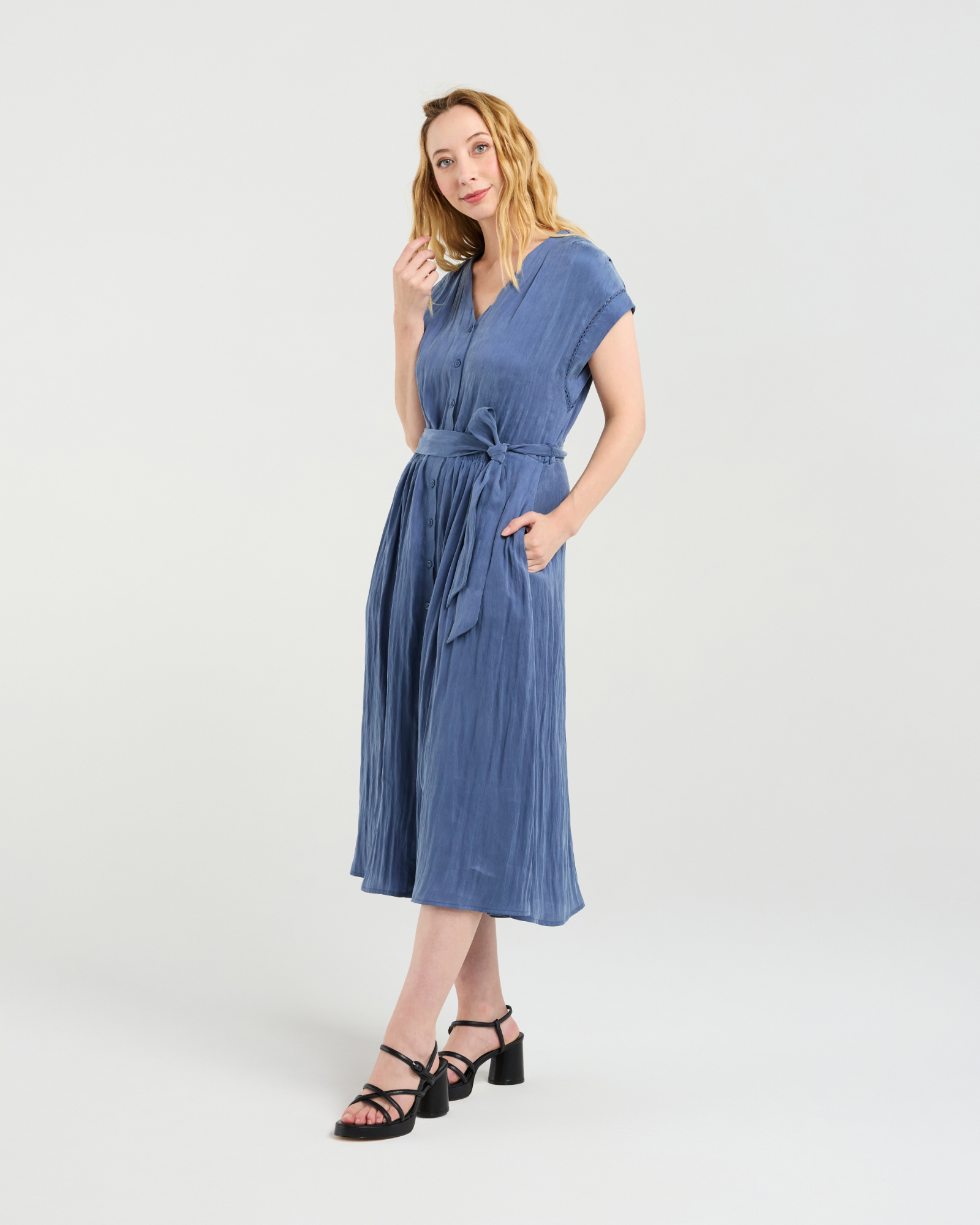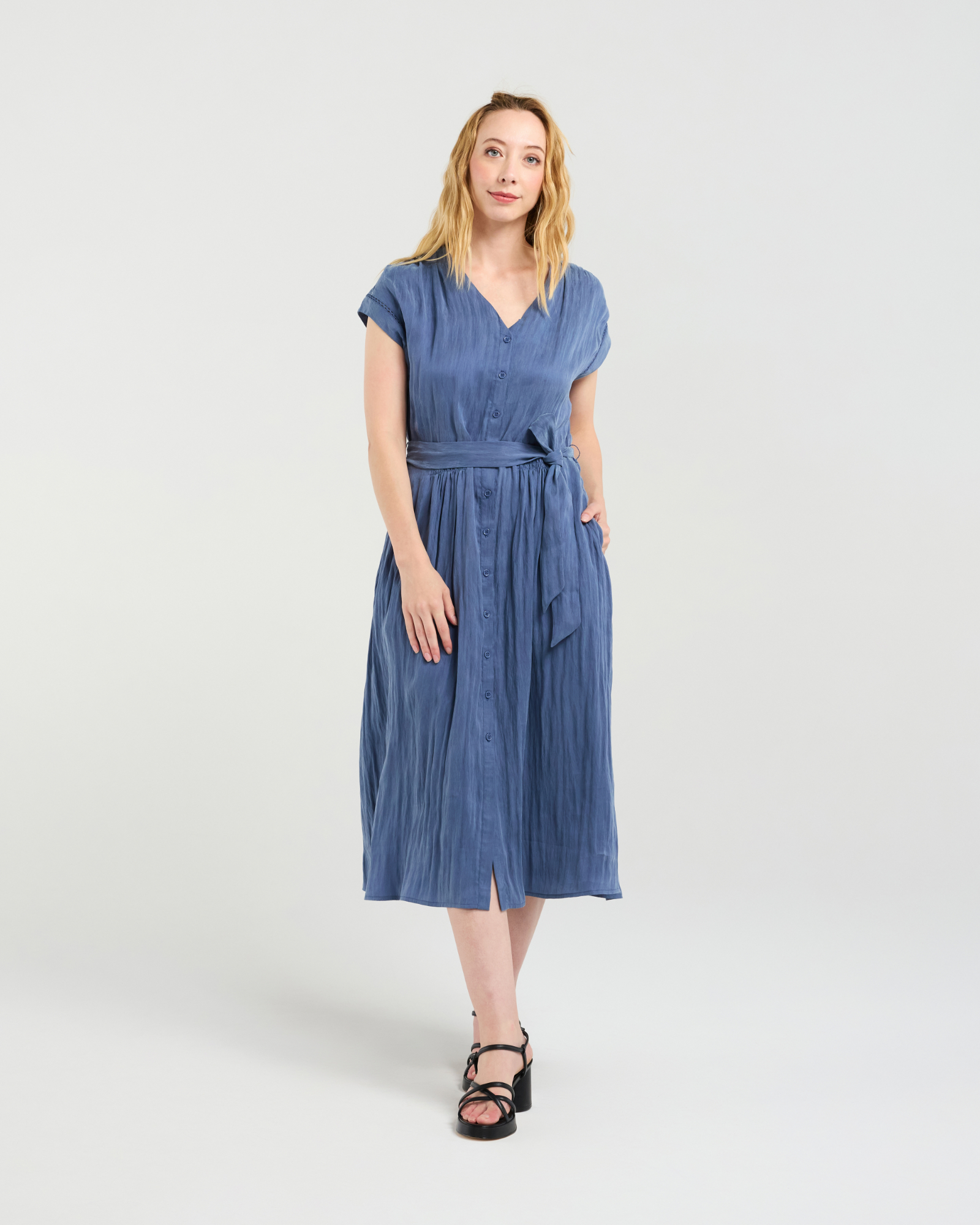 Effortlessly versatile, this below-knee dress comes in a clean, plain blue hue. Featuring a V-neck, short sleeves, and a button-down front, it�s finished with a self-tie waist for a flattering, adjustable fit.