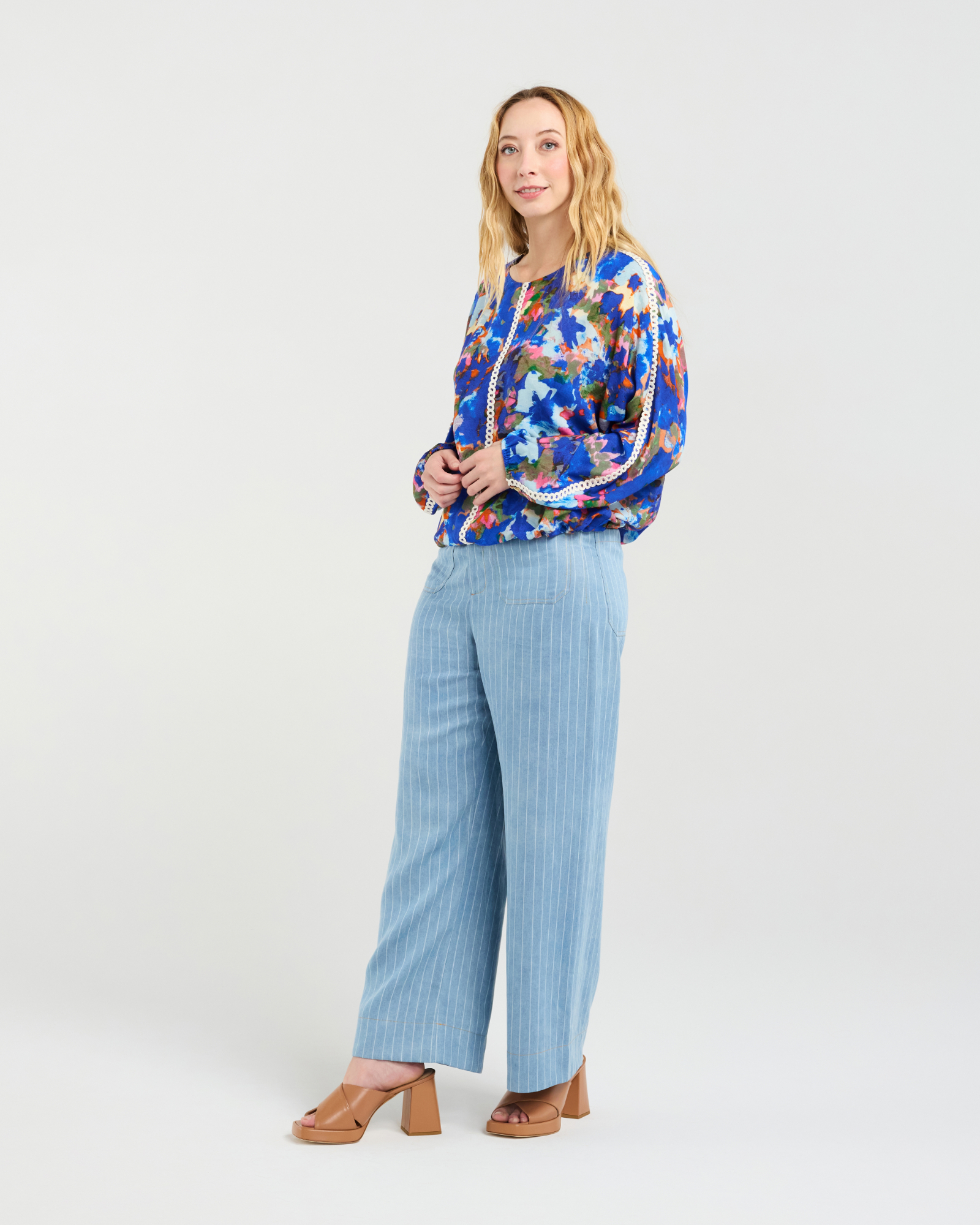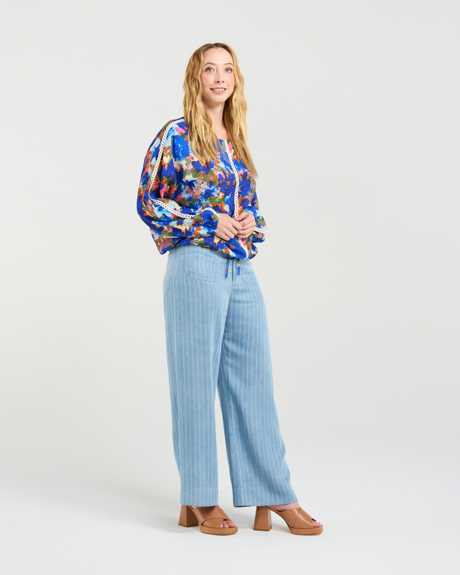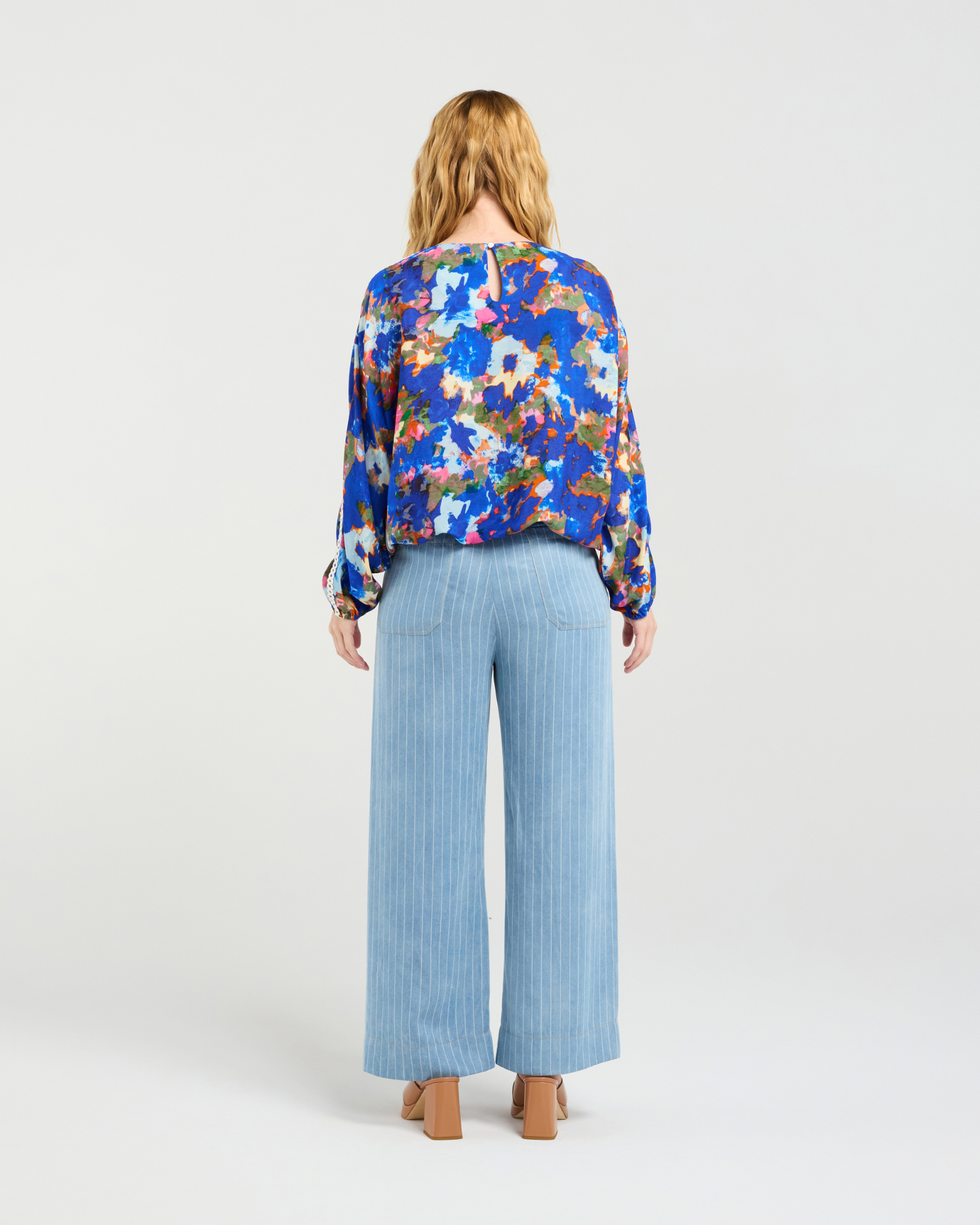 This eye-catching top features long sleeves that are elasticated at the cuff for a structured fit. The bold, colorful print fabric is complemented by trim detail at the front and along the sleeves, while a drawstring at the hem allows for an adjustable, customized fit.