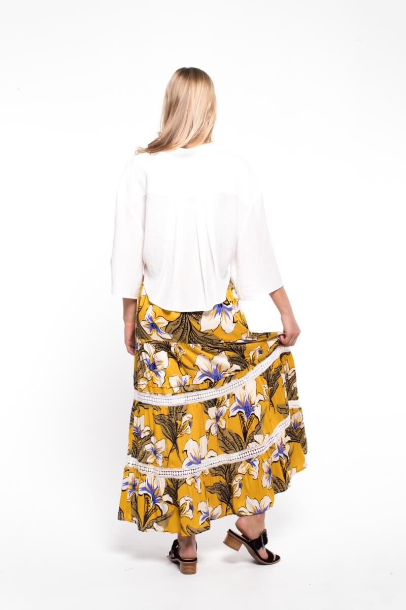 A long tiered silhouette makes this maxi skirt feel breezy and relaxed. Delicate tonal lace stripes complete the look.