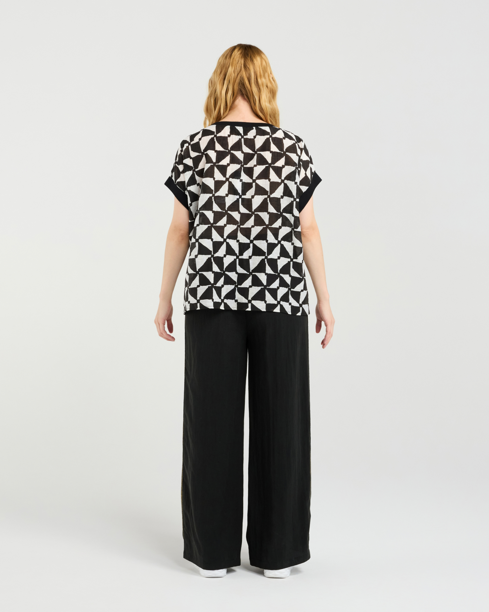A monochrome moment with maximum impact � this relaxed-fit t-shirt features an abstract black and white print for a bold yet versatile look. Ribbed sleeve bands and a matching neckline add a refined finish to the easy silhouette.