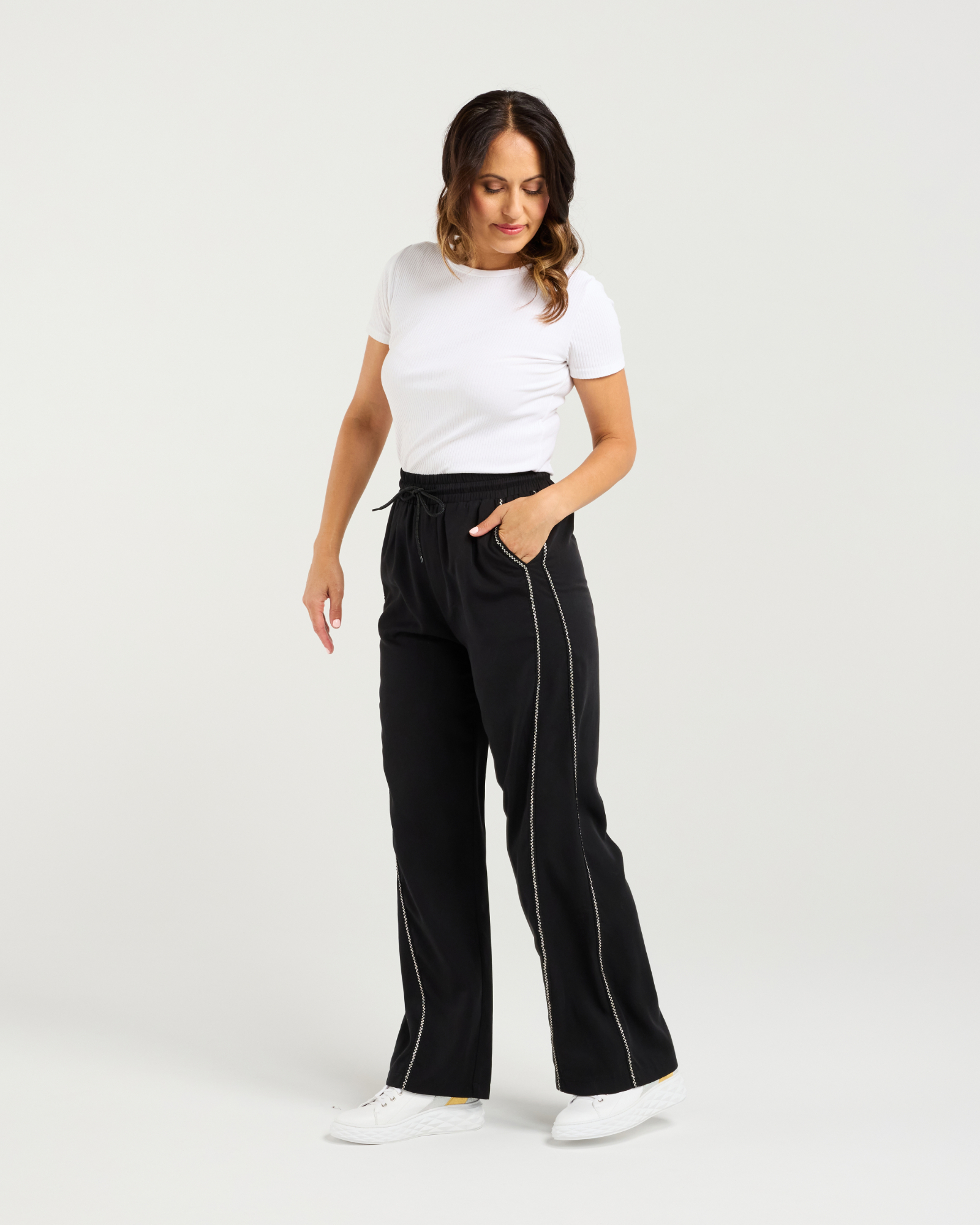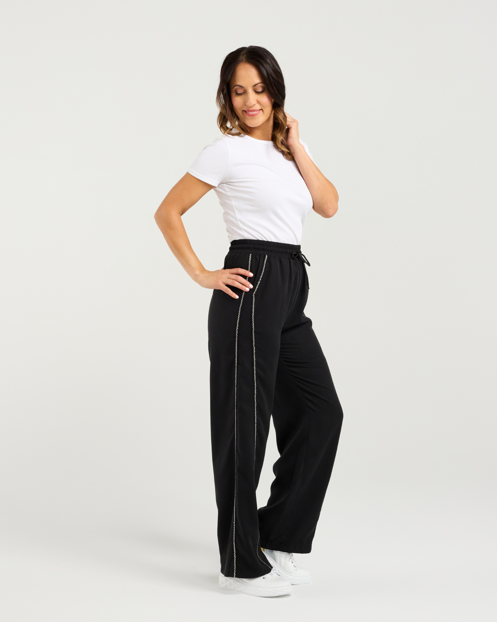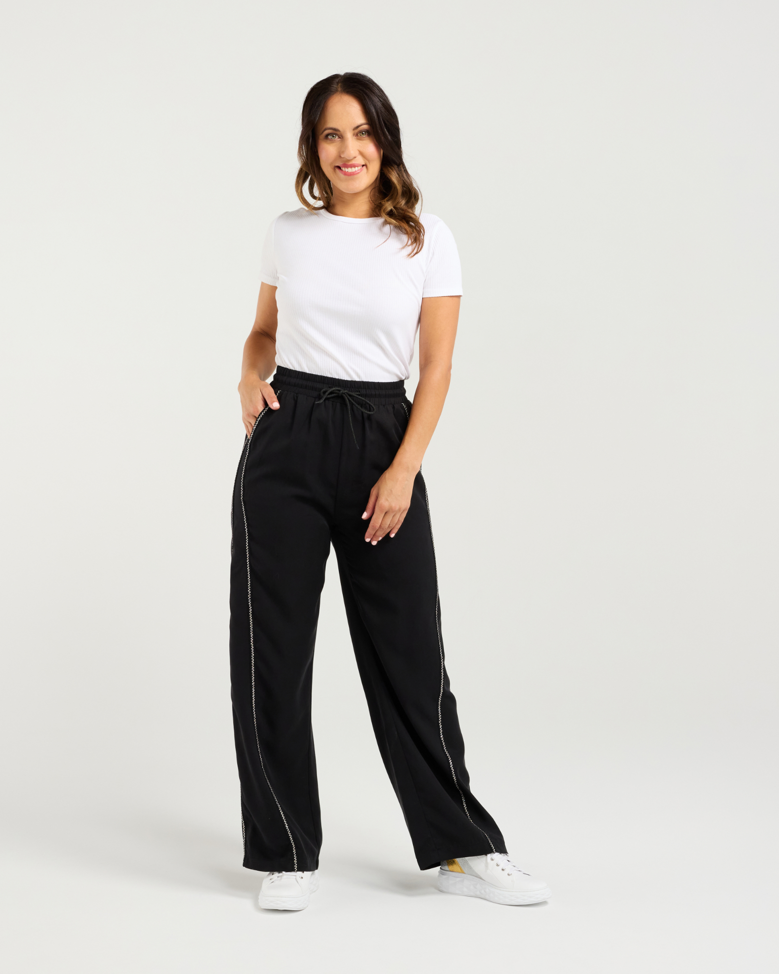 Elevate your casual wardrobe with these high-waisted black pants featuring chic contrast stripes down the sides. Designed for a relaxed fit and crafted from a comfy fabric blend, they effortlessly combine style with comfort. Perfect for everyday wear, these pants add a touch of sporty sophistication to any outfit.