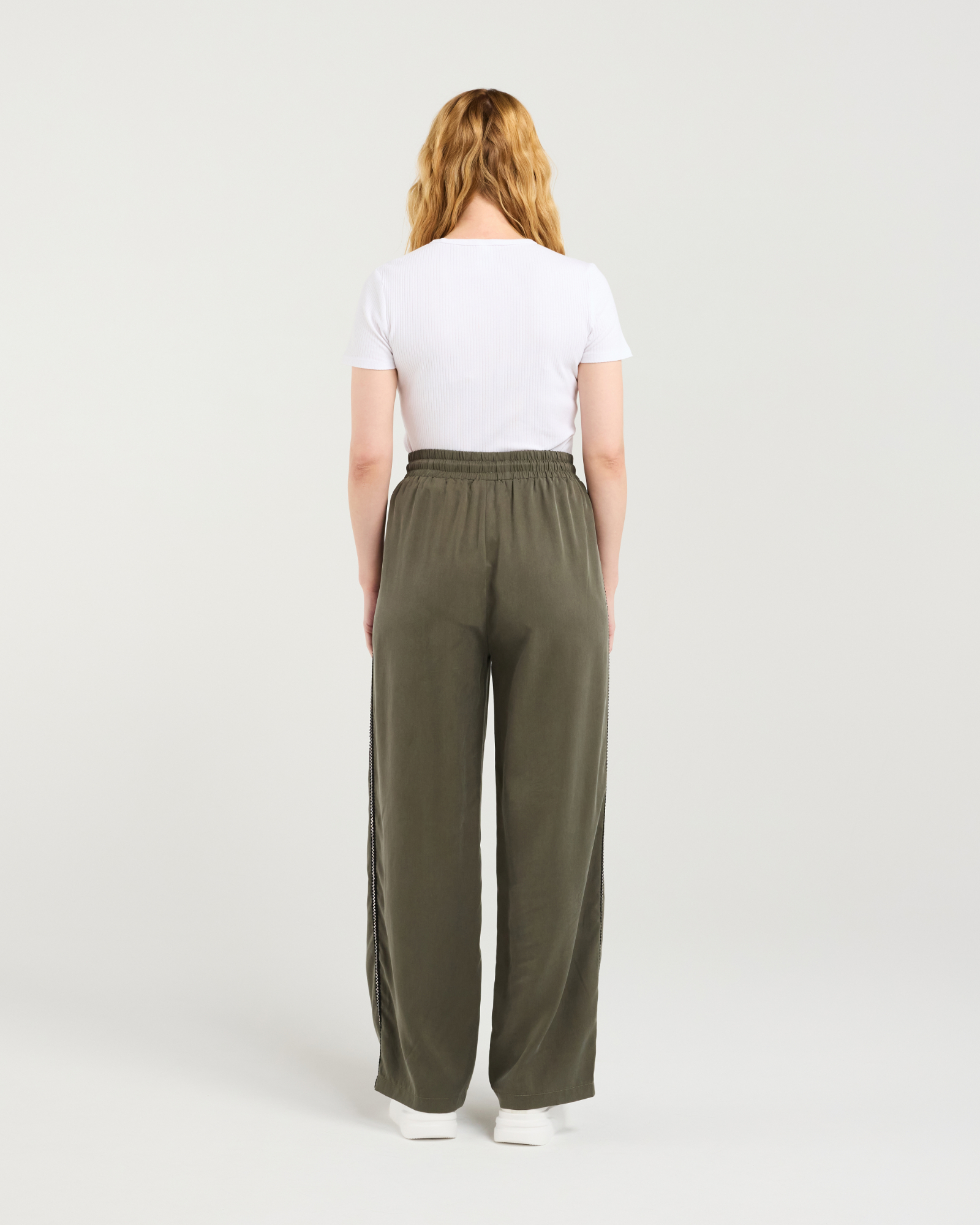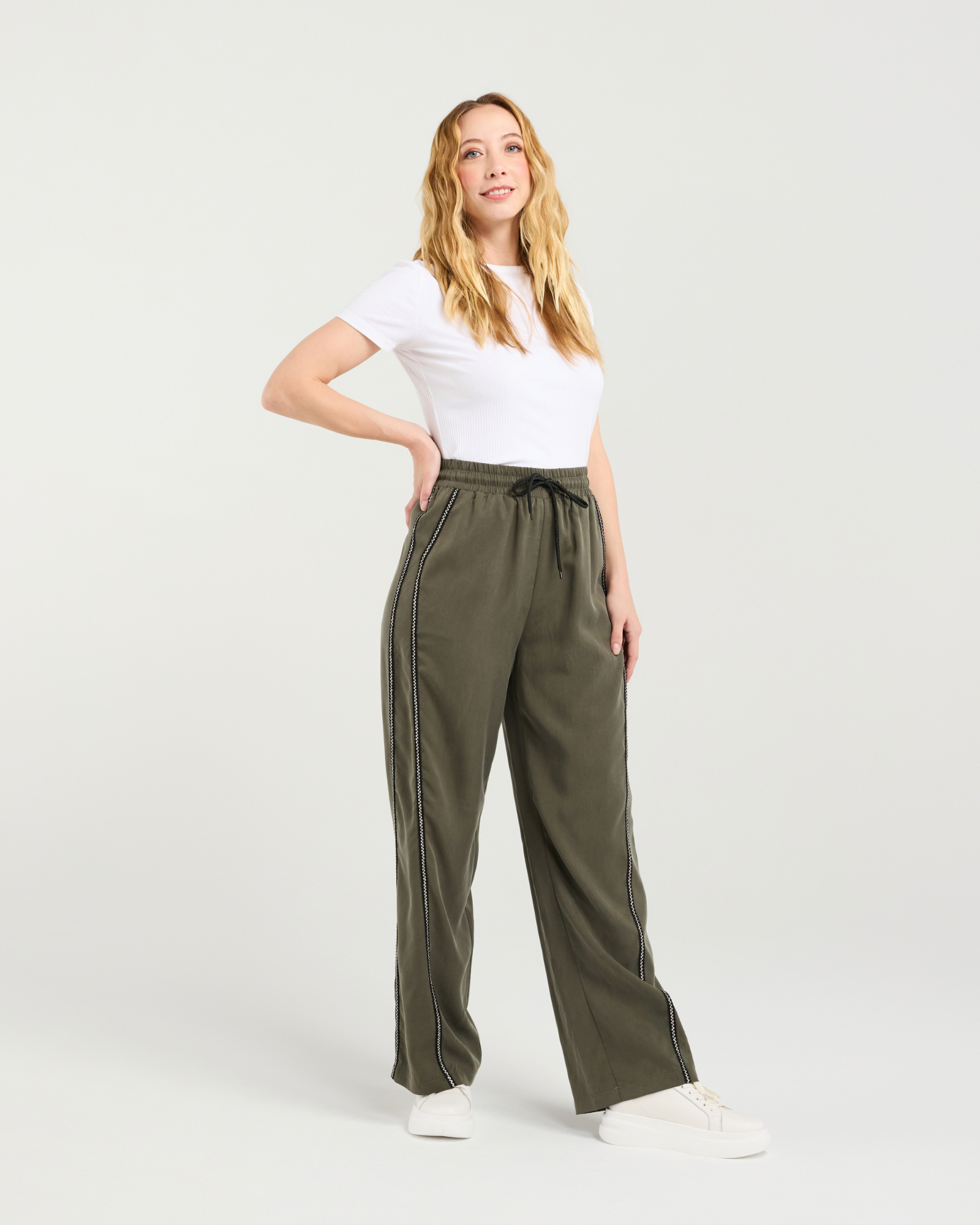 Elevate your casual wardrobe with these high-waisted pants featuring chic contrast stripes down the sides. Designed for a relaxed fit and crafted from a comfy fabric blend, they effortlessly combine style with comfort. Perfect for everyday wear, these pants add a touch of sporty sophistication to any outfit.