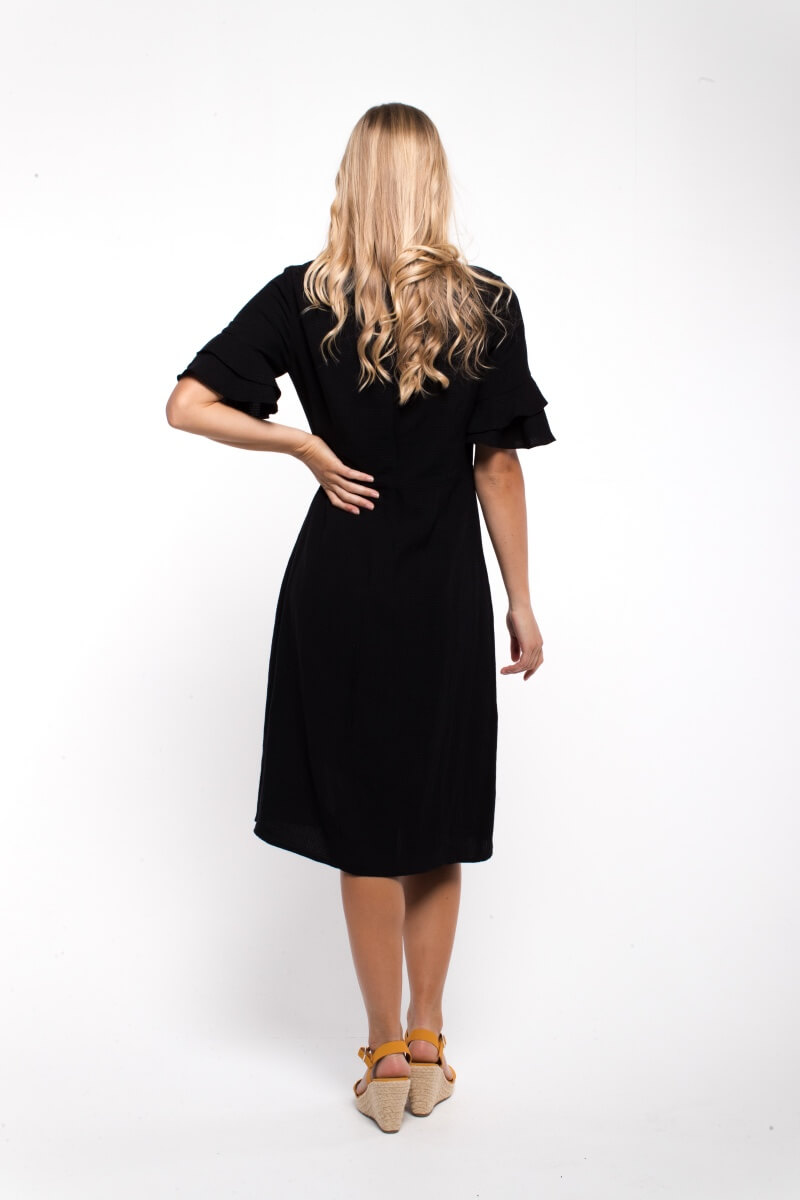 Classically beautiful the Ritzi Dress flatters your figure with ruffle sleeves and slit at the hem.
