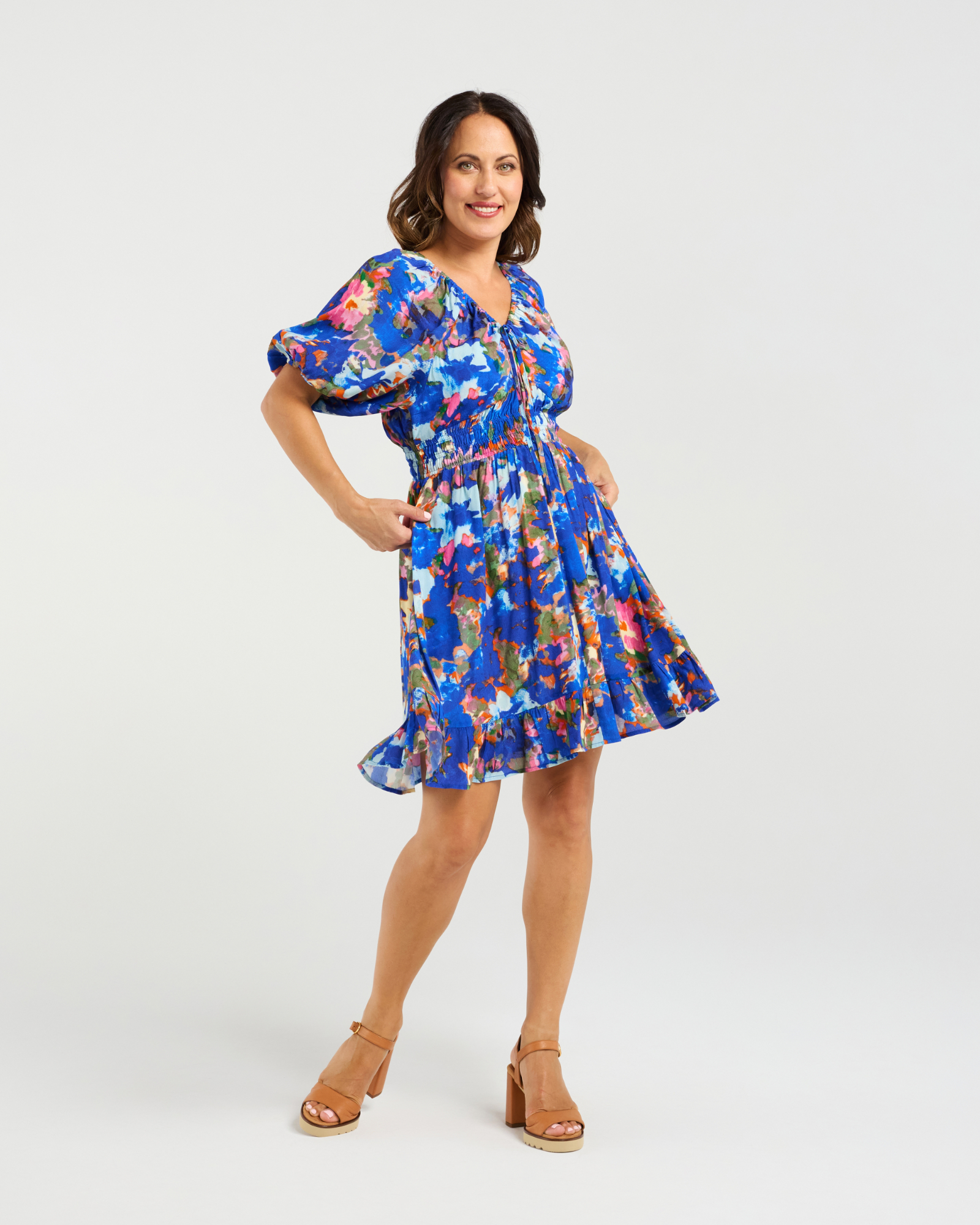 Introducing our versatile above-the-knee dress, designed to effortlessly transition from casual to chic. A vibrant print and a flattering V-neck with delicate ties that can be styled off the shoulder for added allure, this dress offers flexibility in its wear. The elasticated waistline ensures a comfortable fit while accentuating the waist, creating a flattering silhouette.